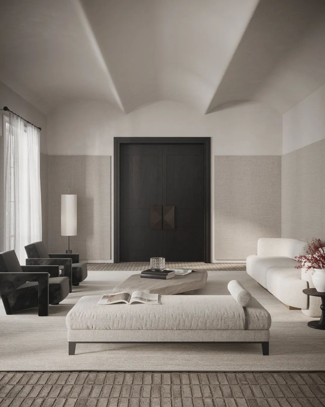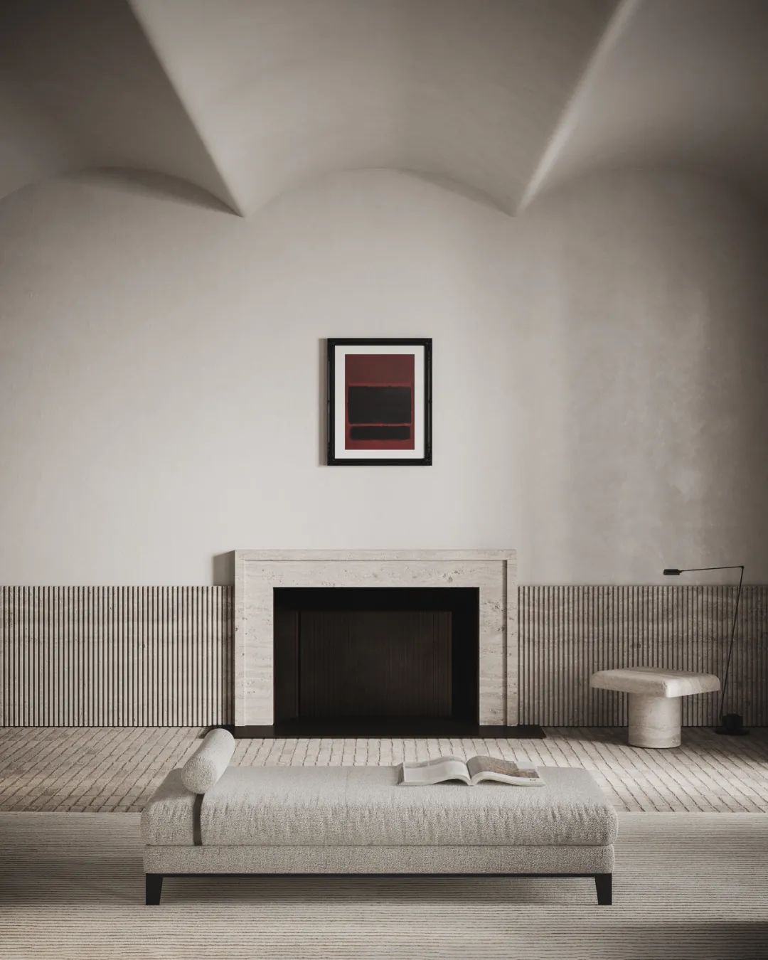 客廳中,設(shè)計師選用暖灰色作為空間的主色調(diào),奠定整體簡約的空間基調(diào)。白色的布藝沙發(fā)搭配上不規(guī)則的石質(zhì)茶幾,不同材質(zhì)的搭配讓空間顯得古樸而有質(zhì)感。對面的深色扶手椅與這片淺色空間形成了色彩上的對比,為屋主打造出自然舒適的社交空間,墻面上的裝飾掛畫,展現(xiàn)出空間的藝術(shù)美感。