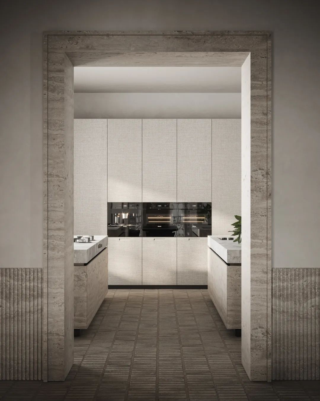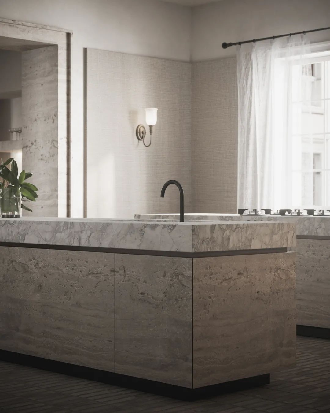 廚房中,對稱式的設(shè)計奠定了整體空間沉穩(wěn)的基調(diào),大面的窗戶保證了室內(nèi)擁有充足的光線,給人明亮的視覺感受。中島臺選用天然石材,細膩的紋理提升了空間的整體質(zhì)感。廚房電器鑲嵌于櫥柜之中,兼具美觀性與實用性。餐桌餐椅同樣選用天然石材,與整體空間相呼應(yīng)。