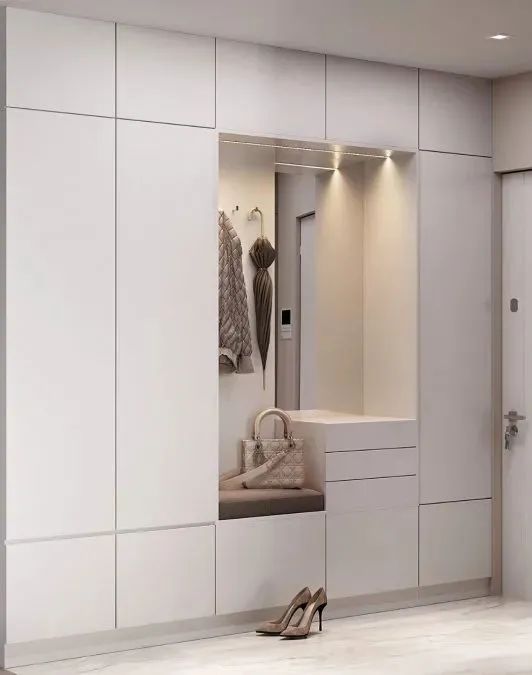 玄關(guān)處設(shè)計師打造了一整座的入門衣柜,內(nèi)嵌的發(fā)光璧龕可做日常的換鞋凳使用。