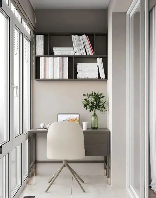 陽臺被設(shè)計成內(nèi)包式,設(shè)計師將它們整體規(guī)劃成辦公區(qū)域和休息空間,羅馬百葉窗的設(shè)計讓陽光盡情地涌入室內(nèi)。