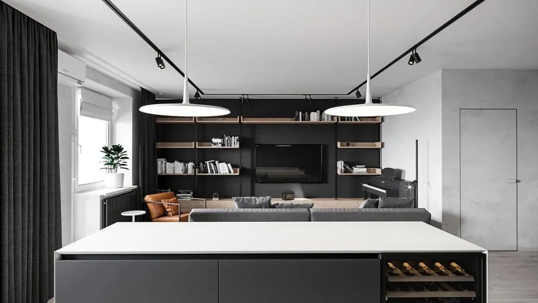 餐廳與廚房位于同一空間,設(shè)計別出心裁。不同高度的雙臺面中島臺,讓其擁有用餐與操作的雙重功能,既美觀又實用。白色中島臺與后方的深灰色櫥柜,形成了顏色上的對比,打造出了空間的深邃感與高級感,豐富了空間的層次。