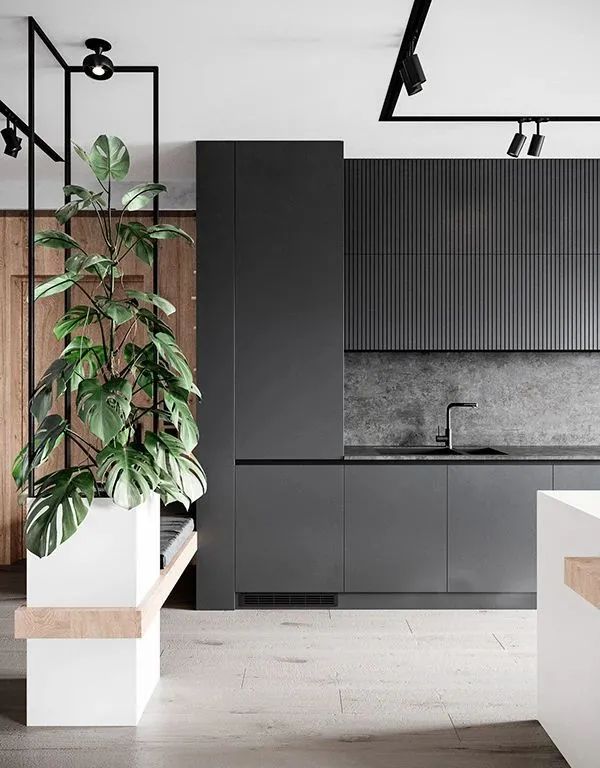 設(shè)計師利用高級灰的配色,在簡約現(xiàn)代的空間中打造出高級質(zhì)感。再加上原木材質(zhì)與綠色植物的點綴,打造出了現(xiàn)代都市生活下簡練與優(yōu)雅的生活氛圍