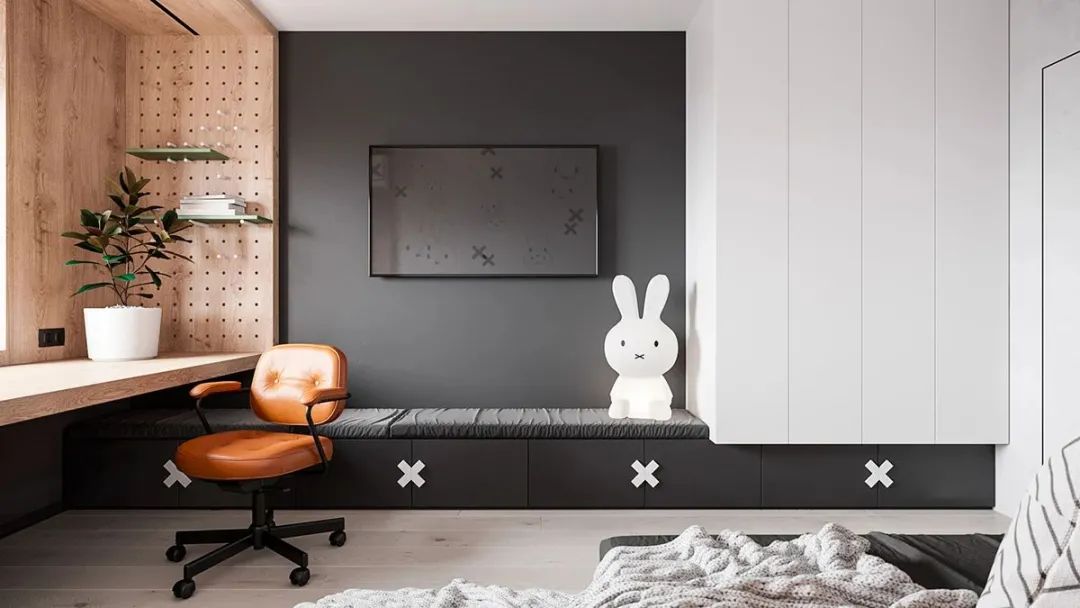 兒童房的設(shè)計中,除了使用了高級耐看的黑白灰配色,還加大了橙色的面積,為空間帶來了活力感。