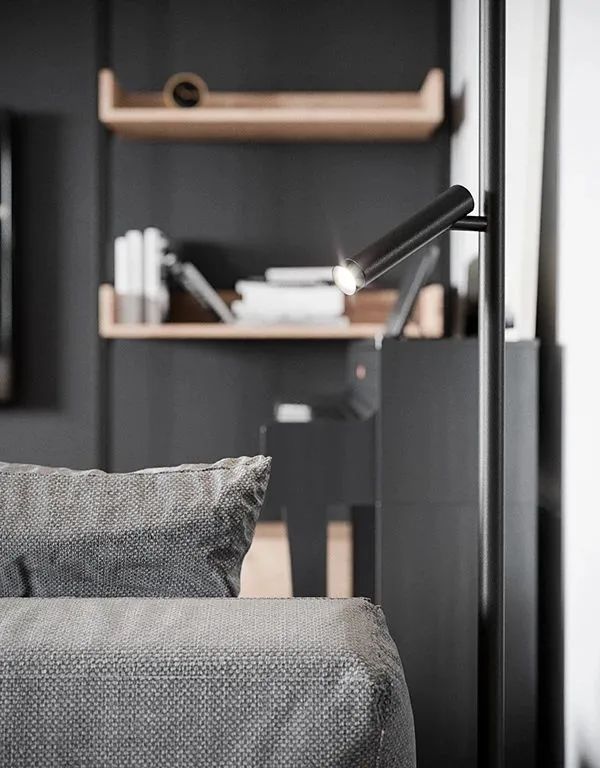 客廳處,設(shè)計師使用了開放式設(shè)計,營造出寬敞開闊的視覺感受。利用灰色的布藝沙發(fā)搭配格紋毛絨地毯,奠定空間整體的沉穩(wěn)高級基調(diào)。黑白灰的合理運用讓空間的色調(diào)和諧統(tǒng)一。閱覽區(qū)處的原木材質(zhì),點綴了整體黑白灰的空間,讓空間更加通透。
