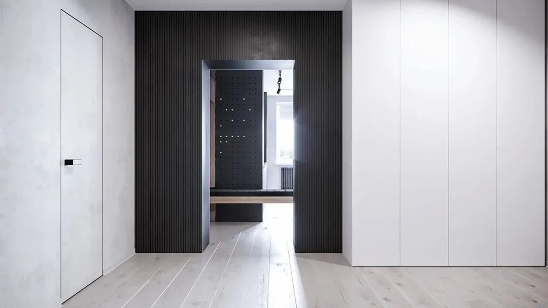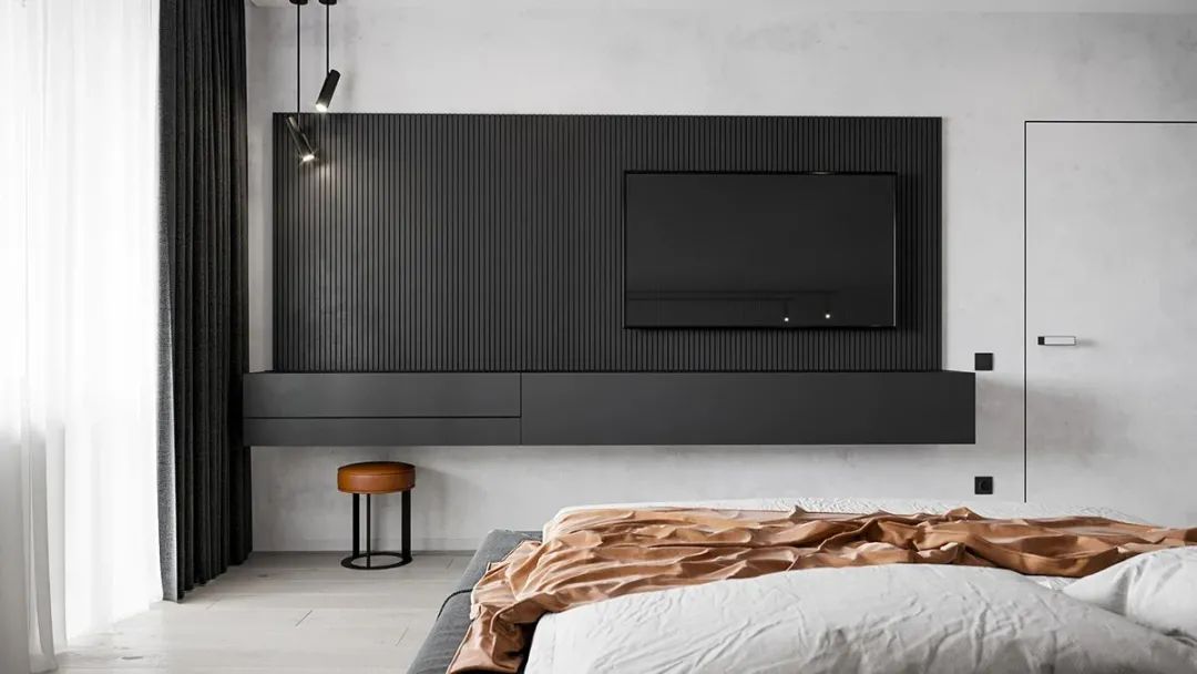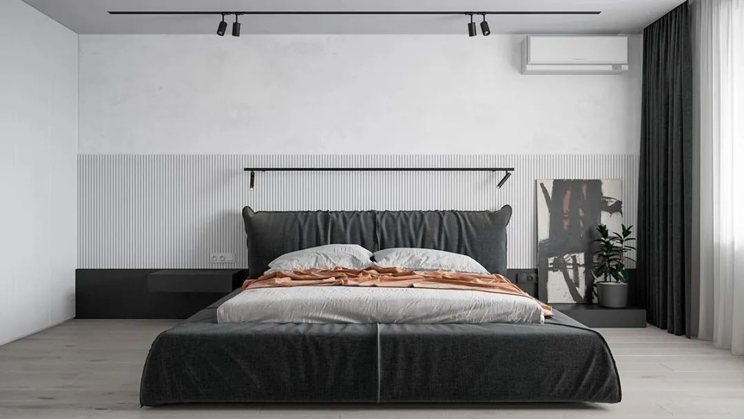 主臥依舊是延續(xù)黑白灰的高級配色,將簡約的手法與高級的色調(diào)融合??臻g中利落的線條,展現(xiàn)出現(xiàn)代極簡主義下的幾何美感?;疑档拇财反钆渖弦荒▋裳鄣某壬?,為空間帶來活力,打造出了一個溫馨舒適的休憩空間。