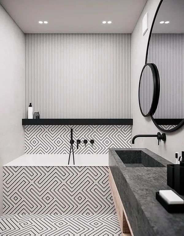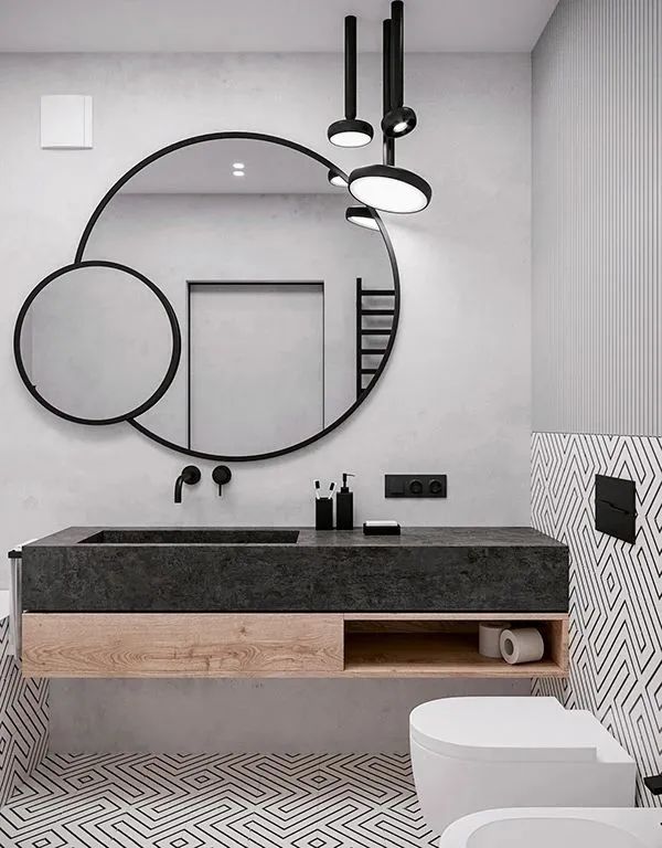 衛(wèi)生間的設(shè)計時尚而高級,空間中的簡約線條,現(xiàn)代而高級。深灰色臺盆與木色柜體相互融合,形成了色彩上的對比。圓形的梳妝鏡,造型簡潔而不失美感。