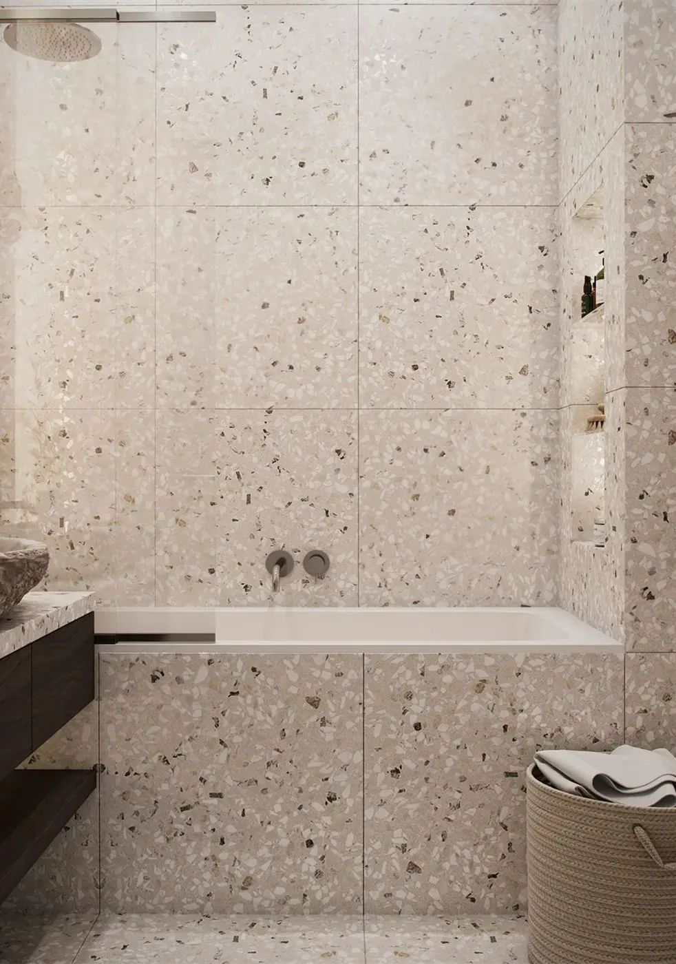 浴室利用水磨石作為鋪墊,大理石搭建的洗漱臺看起來大氣有格調(diào)。利用干草植物和藤編織物的收納筐用來點綴室內(nèi),顯得整體既清新又治愈。