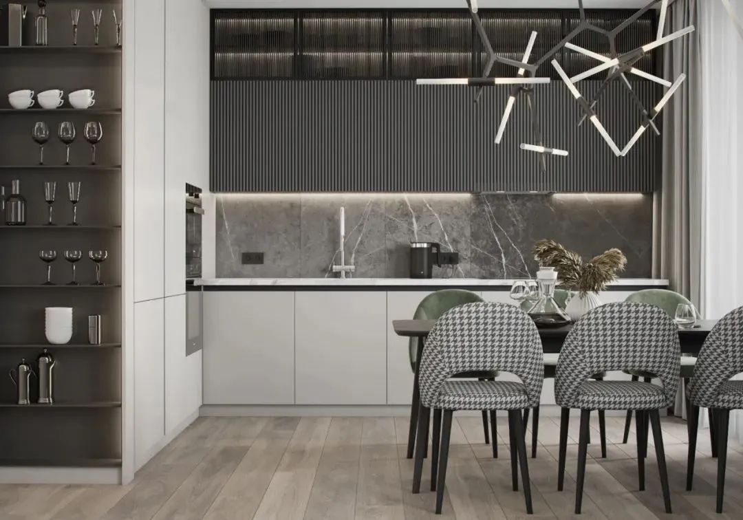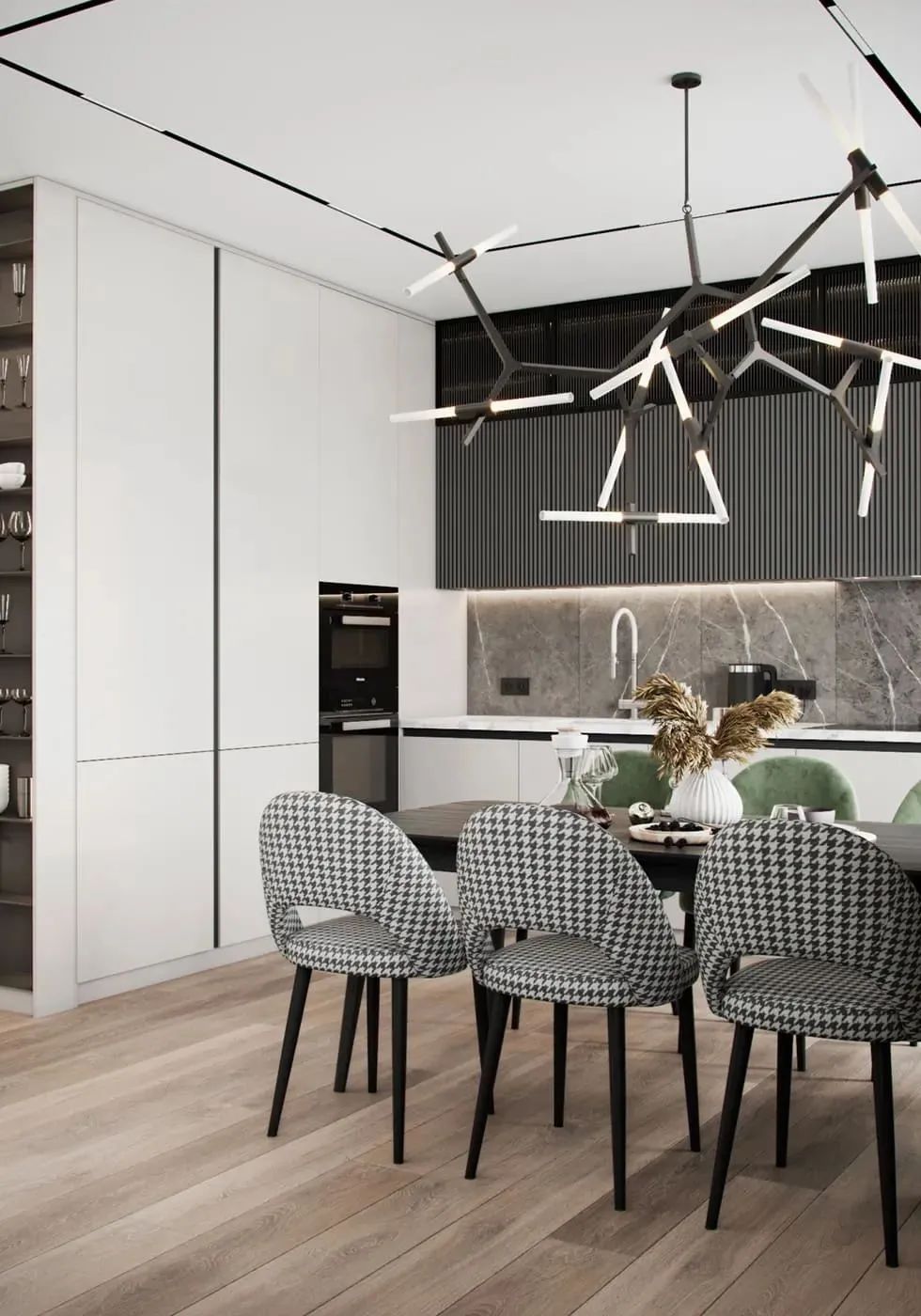 客廳和廚房、餐廳一體化的設(shè)計,讓整個視覺空間看起來更加寬廣。餐桌上方造型感十足的燈飾成為了整個空間的亮點,相互交錯的時尚設(shè)計帶來強烈的視覺效果。