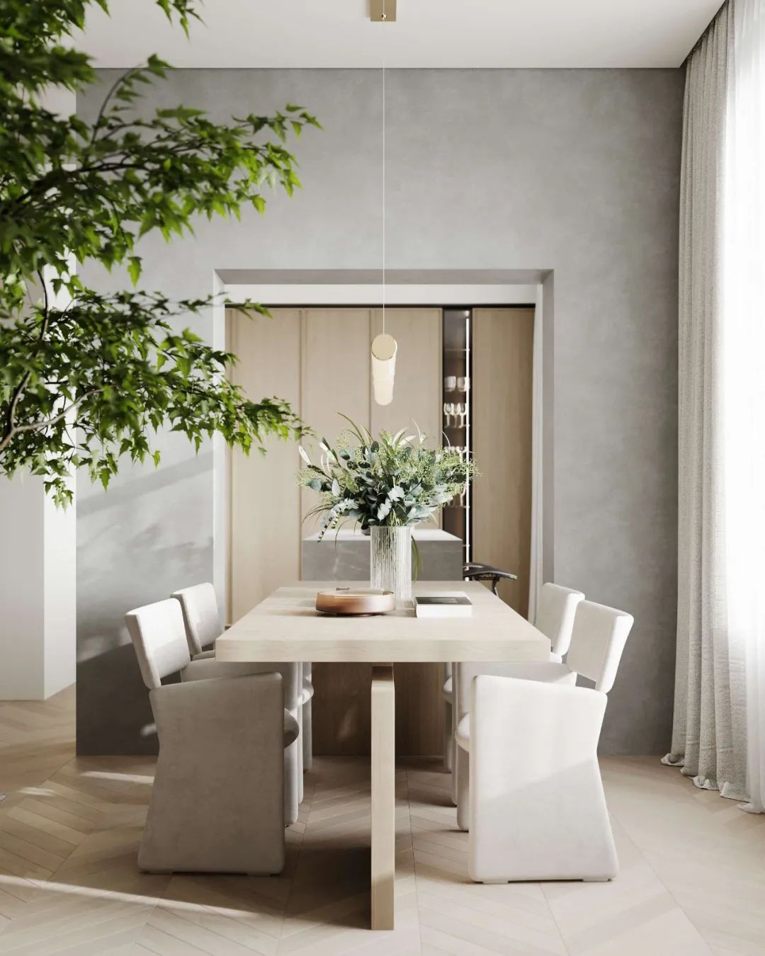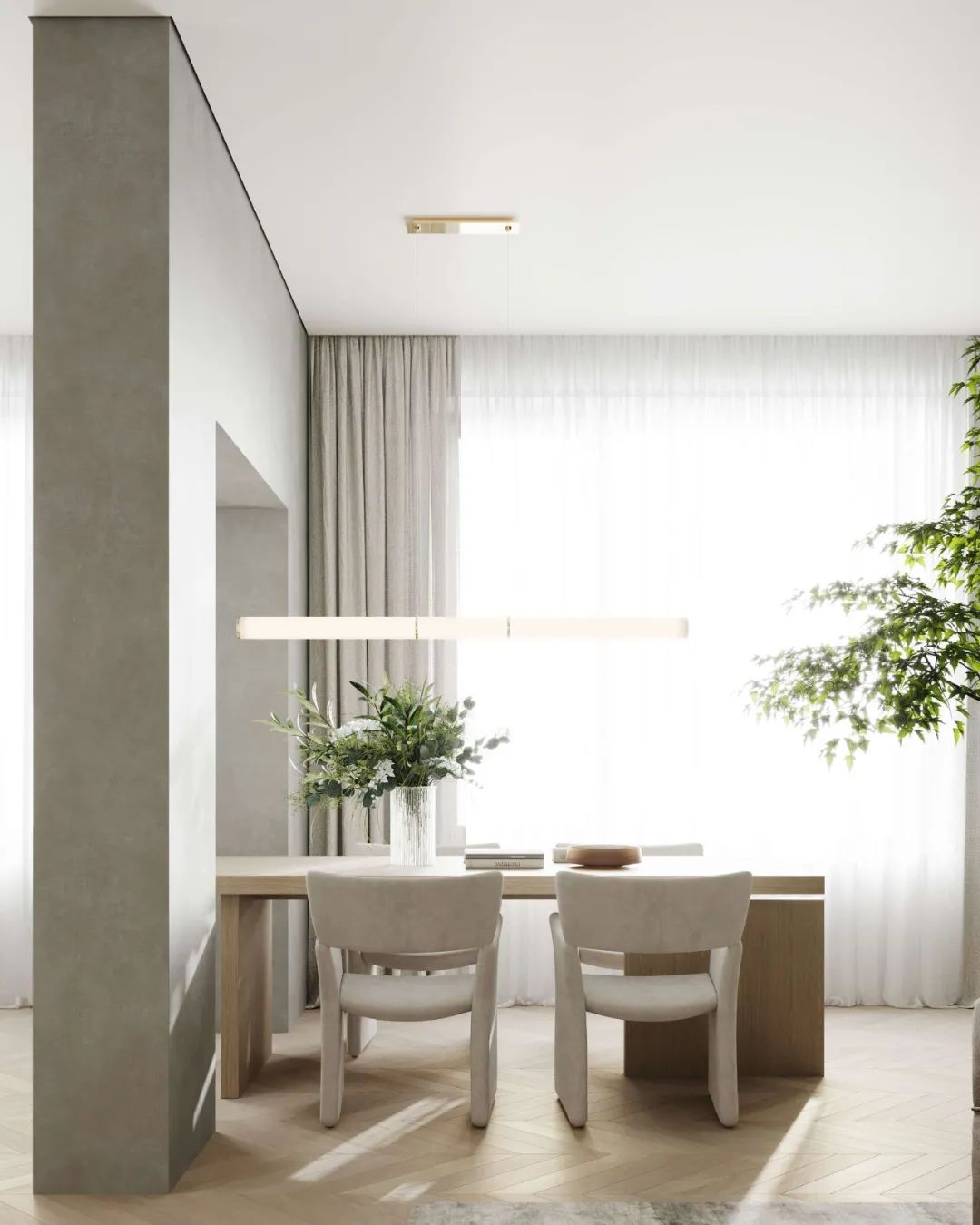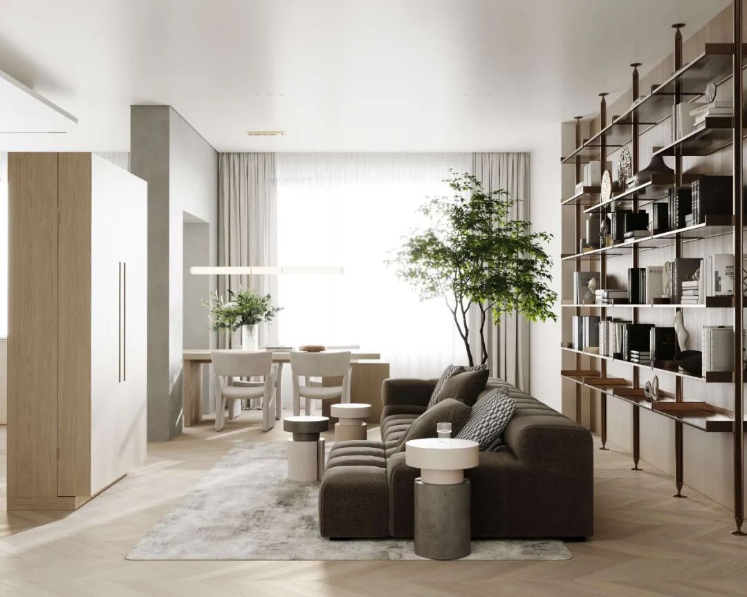 設計師在客廳進行了巧妙處理,通過電視柜的折疊和移動,可以更好地利用室內(nèi)空間。整體色調(diào)以暖灰色為主,在色彩上進行了統(tǒng)一,不同材質(zhì)的效果結(jié)合整個空間變得更加具有層次感,綠色的植物展示了空間的自然氣息。