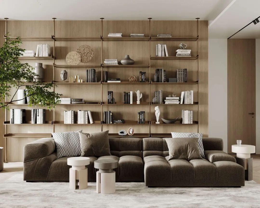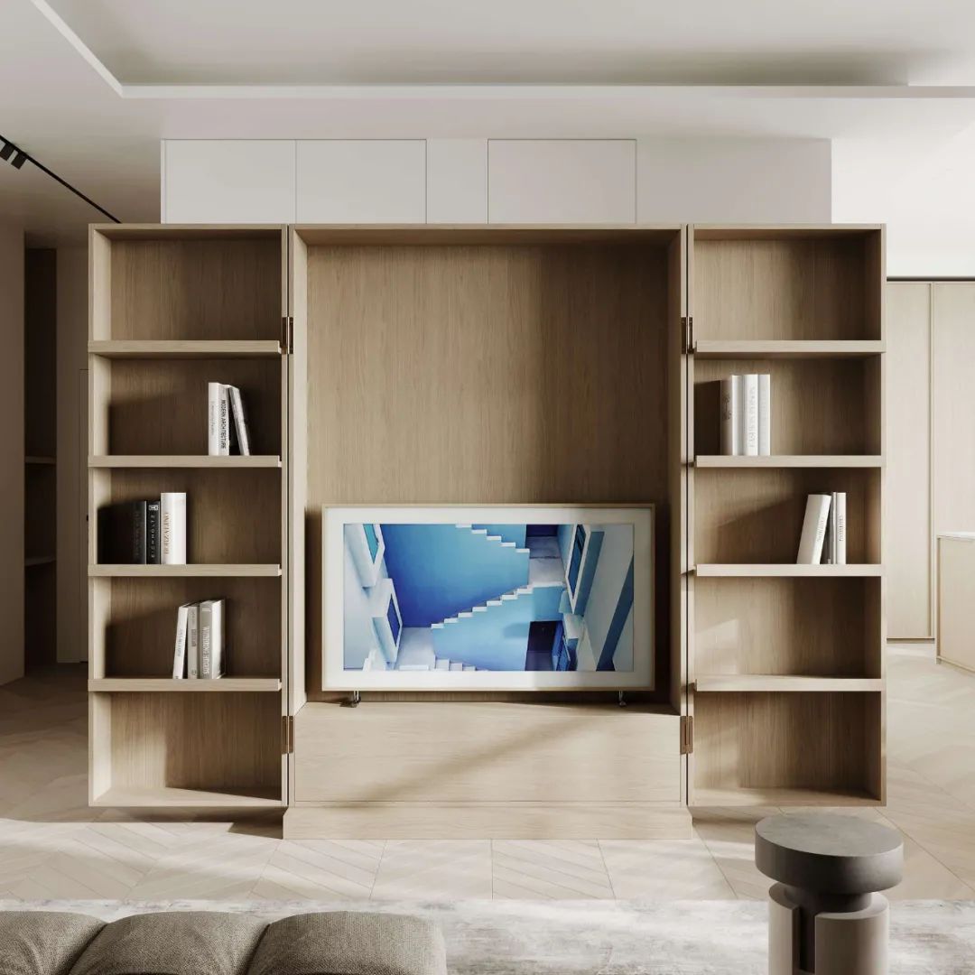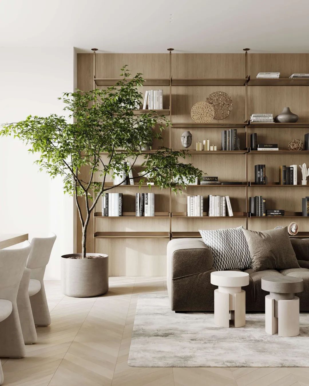 設計師在客廳進行了巧妙處理,通過電視柜的折疊和移動,可以更好地利用室內(nèi)空間。整體色調(diào)以暖灰色為主,在色彩上進行了統(tǒng)一,不同材質(zhì)的效果結(jié)合整個空間變得更加具有層次感,綠色的植物展示了空間的自然氣息。