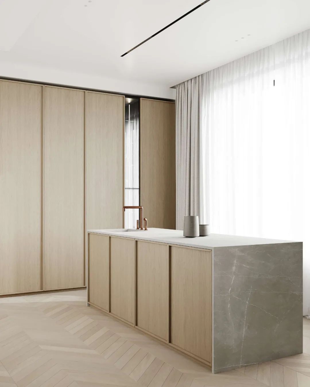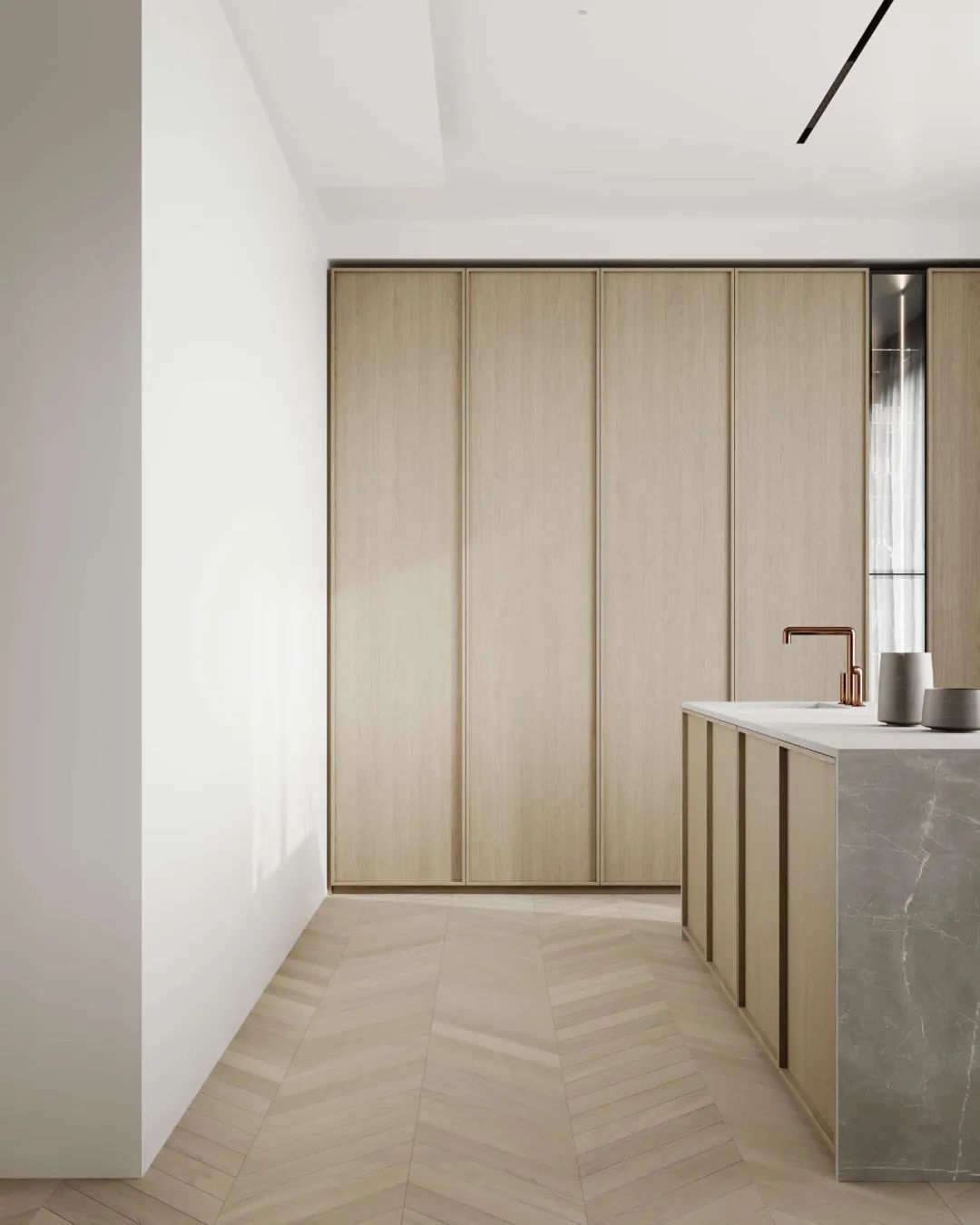 餐廳選用米色和駝色進行主色調(diào)的搭配,溫暖的色彩突出了家的溫馨。大理石和原木色更加豐富了空間的層次,也增加了空間的自然感。