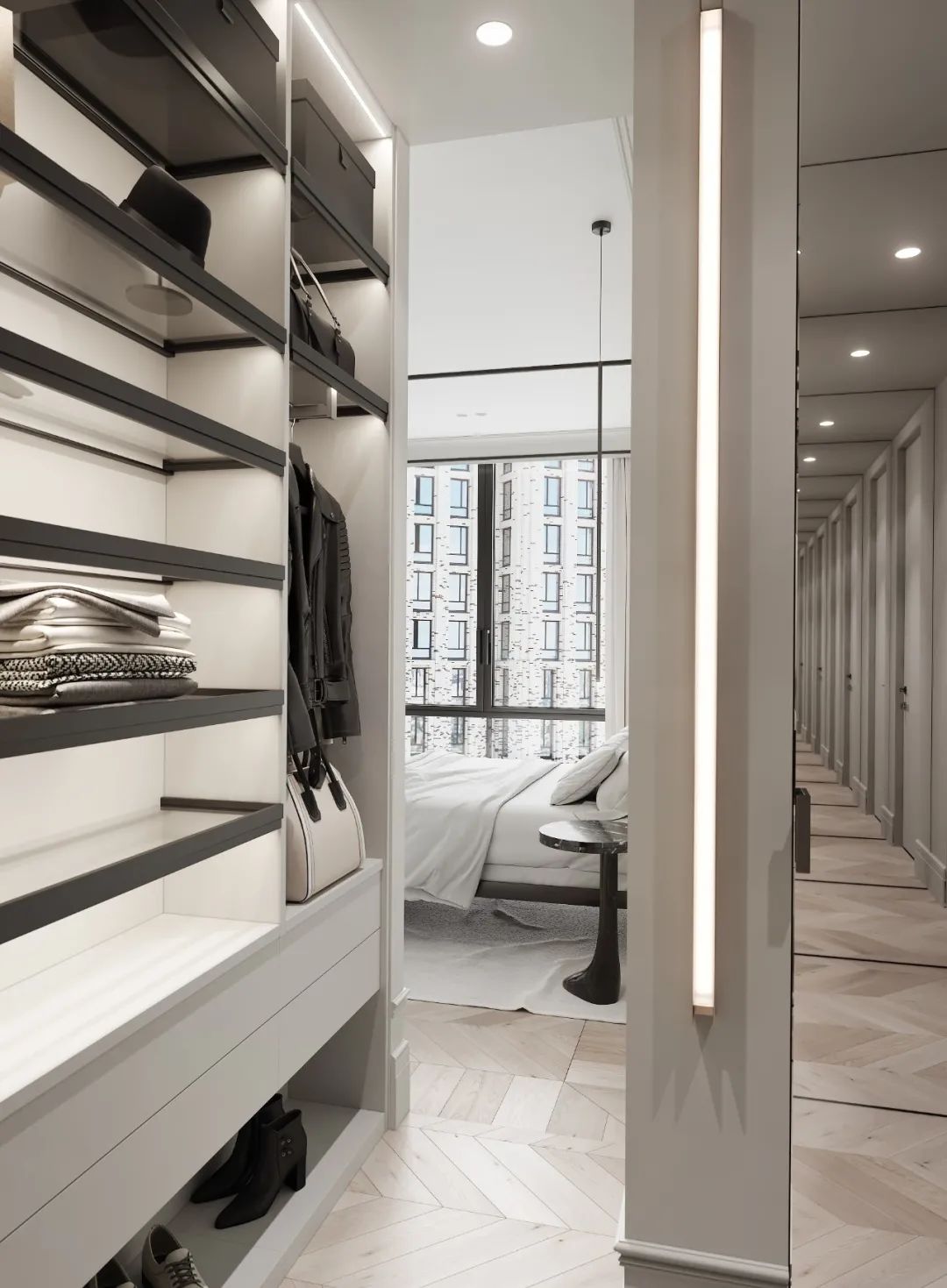 設(shè)計(jì)師在內(nèi)部設(shè)計(jì)中采用了方形,同時(shí)采用了餐盤形狀的吊燈,讓整個(gè)客廳顯得柔和簡(jiǎn)潔??蛷d和用餐區(qū)以及廚房就證據(jù)了整個(gè)公寓的一半。