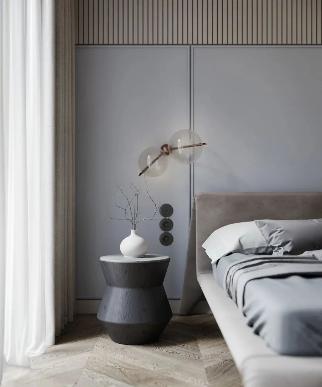 臥室以米色調(diào)為主,佐以淡灰色的軟飾,吊燈融入了禪意的元素,讓人心情寧靜,一股平和心情油然而生。
