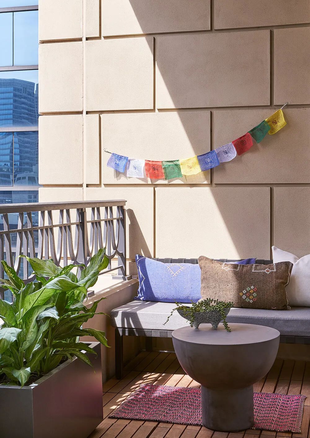 戶外休憩區(qū)小而溫馨,放置了五彩斑斕的抱枕和裝飾物品,綠植的加入讓空間更為靈動(dòng),室內(nèi)外呈現(xiàn)一派舒適、和諧的景象。