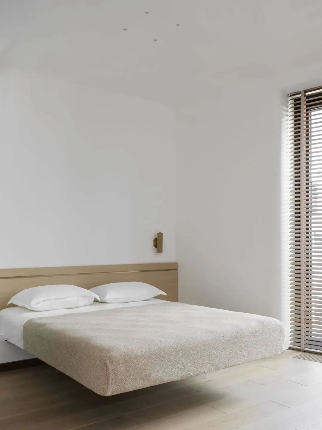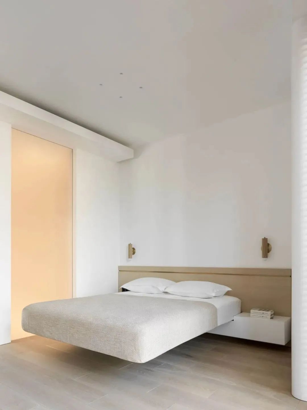 臥室延續(xù)了流暢的線條和漂浮的主題,懸空的床體十分吸睛,給人們帶來新奇的視覺體驗。床頭柜與床相連接,更具一體性。一旁的木質(zhì)書桌與櫥柜相連接,為屋主提供了一個能夠?qū)P墓ぷ鞯目臻g。一旁的落地窗,也能讓屋主欣賞到窗外的美景,十分輕松愜意。