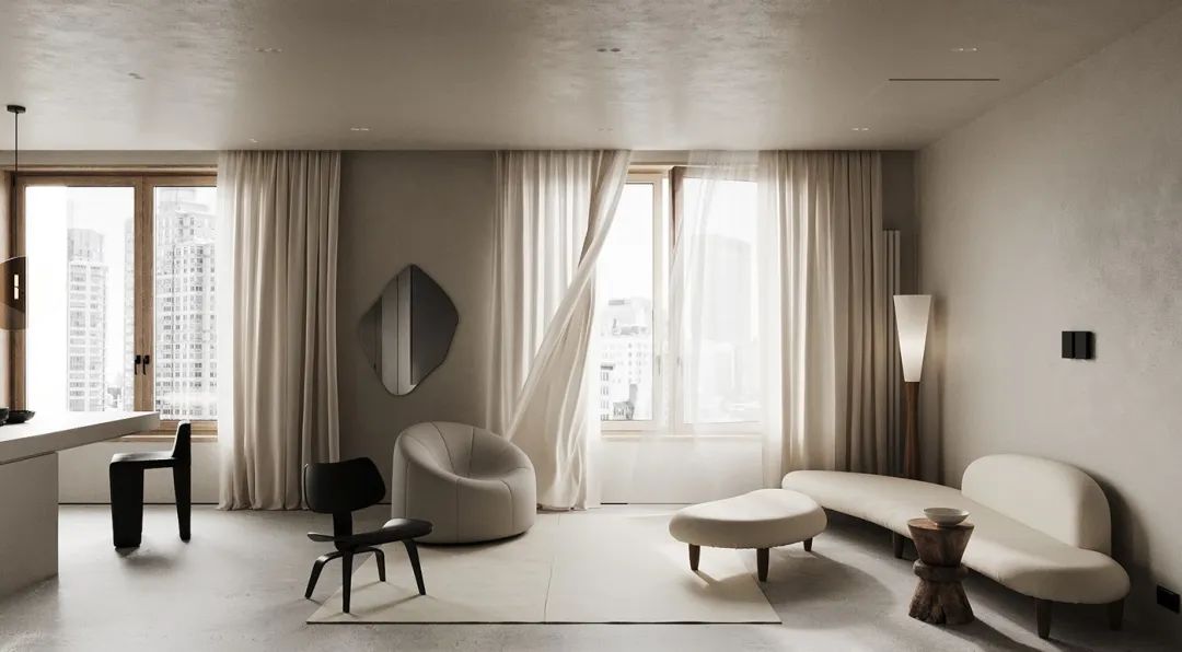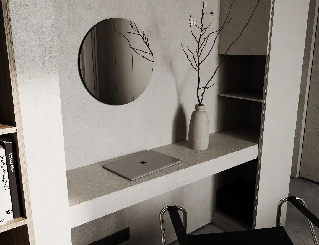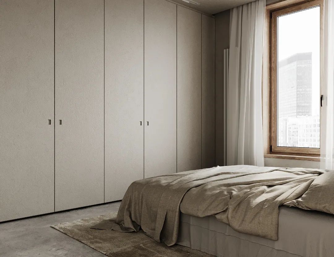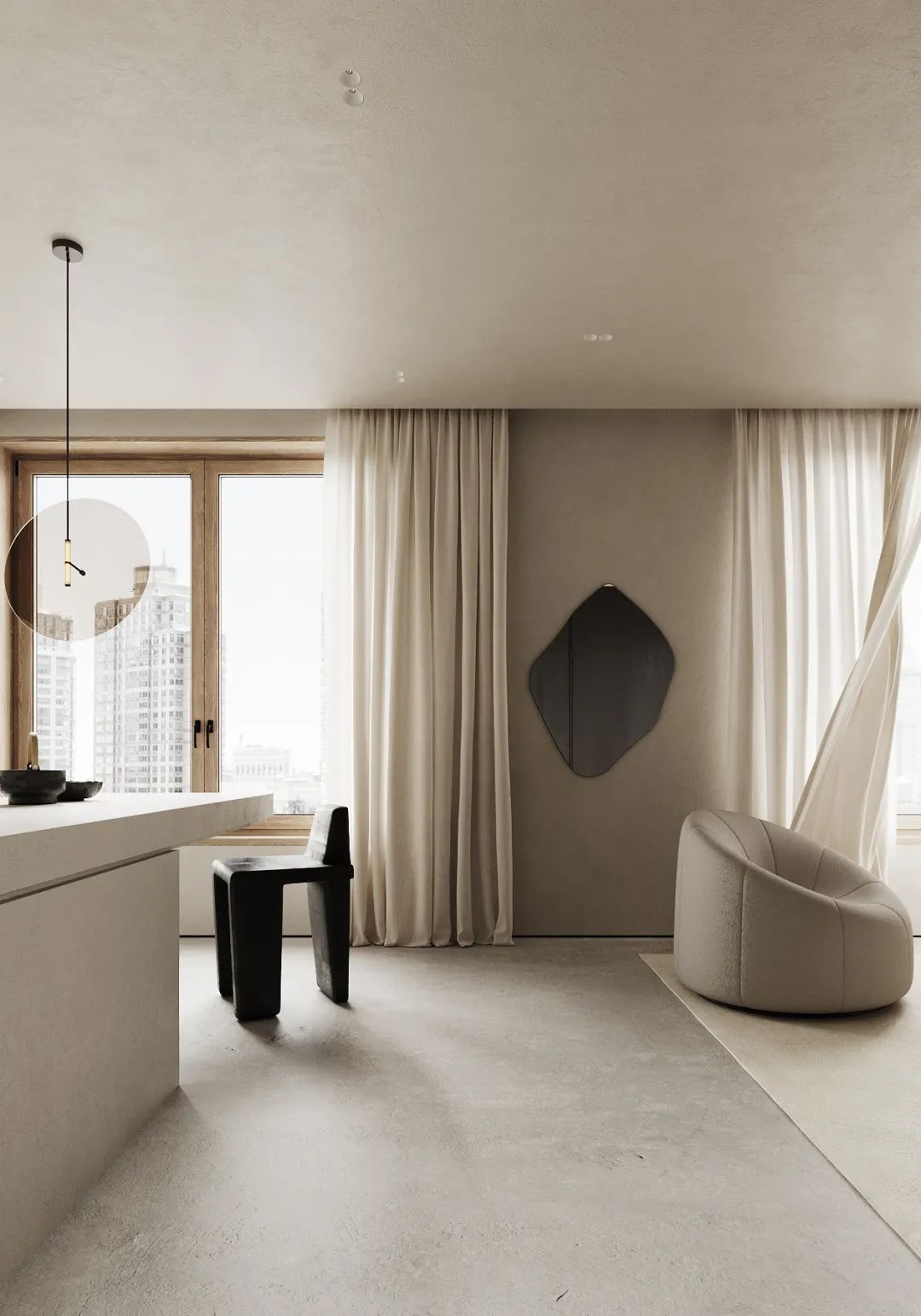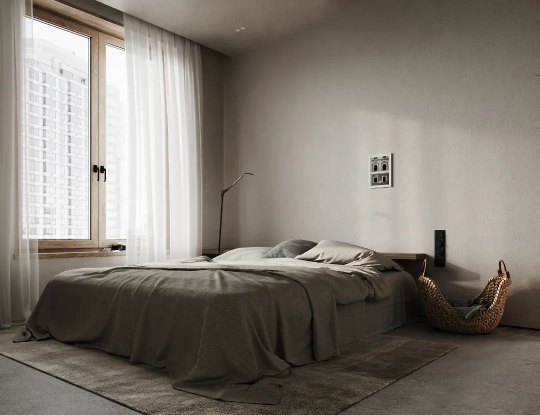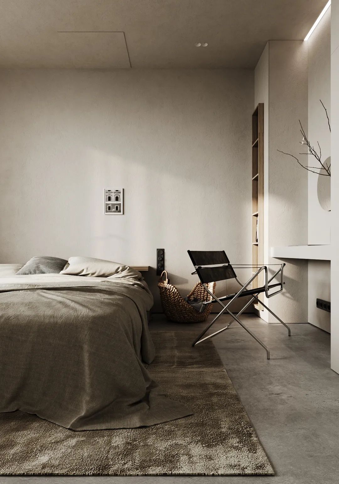 臥室運用極簡主義的設計手法,利用微水泥創(chuàng)造了一個充滿藝術(shù)格調(diào)的空間,材質(zhì)和色彩均與空間整體相呼應,從配飾的細節(jié)上來看,設計師更偏于古典和獨特的風格。