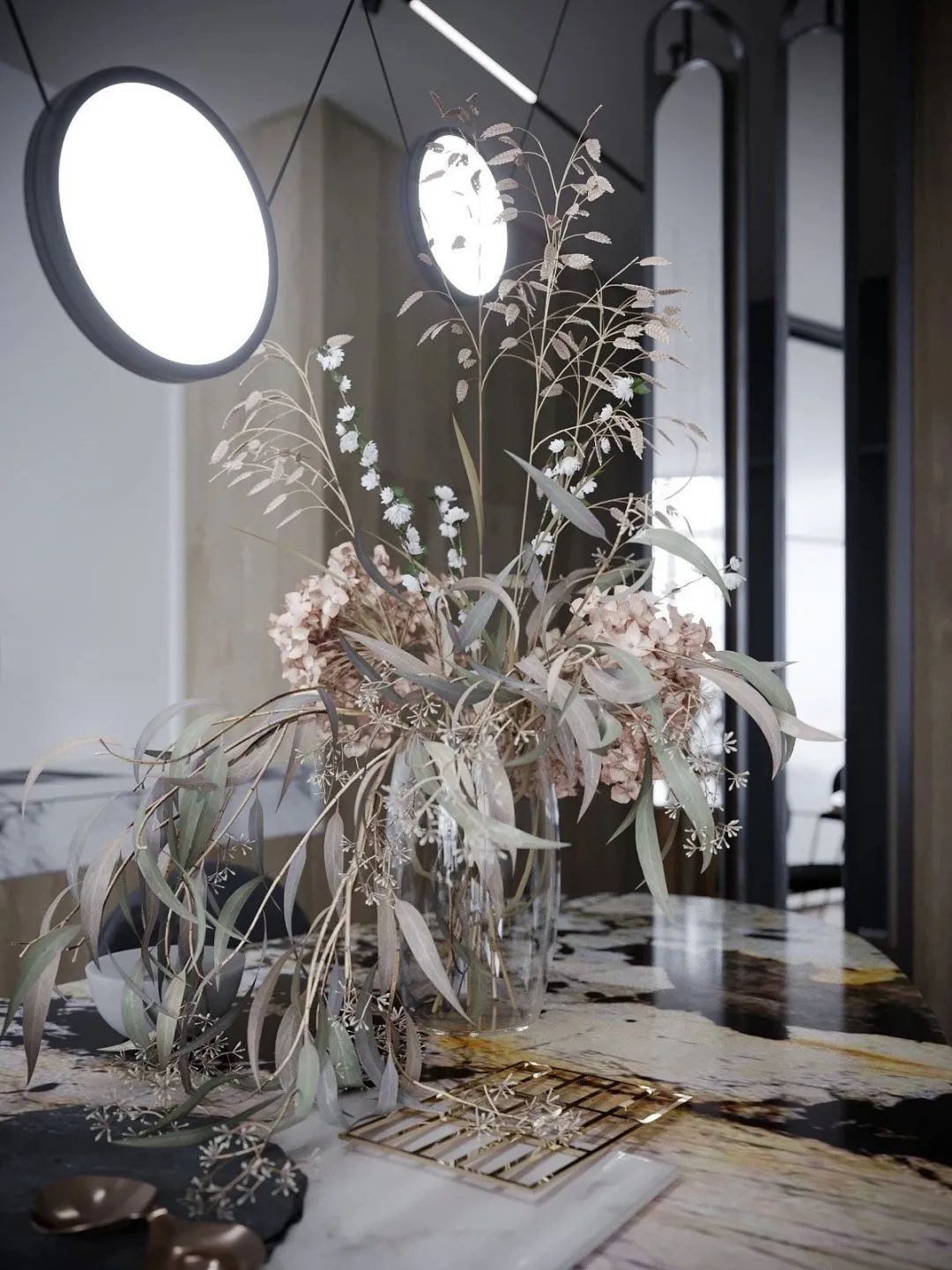 餐廳與廚房位于同一空間,在客廳的旁邊,開放式的設(shè)計(jì)很好地利用了不大的空間。廚房的操作臺(tái)選用白色大理石面板增添了空間的輕奢氛圍,疏密有致的自然紋理相互呼應(yīng),整體簡約而精致。餐桌上方的裝飾植物展現(xiàn)了空間的生活美學(xué)。
