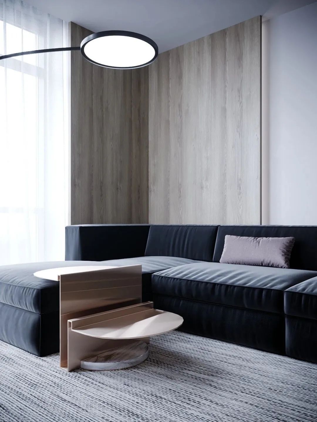 客廳中,設(shè)計(jì)師選用高級灰作為空間的主色調(diào),再搭配金屬與原木元素作為空間的點(diǎn)綴,打造簡約輕奢的質(zhì)感。造型簡潔的落地?zé)?,線條感十足,為客廳增添明亮的視覺感受。深灰色的沙發(fā)使得空間更加沉穩(wěn),金屬的邊桌提升了空間的質(zhì)感。